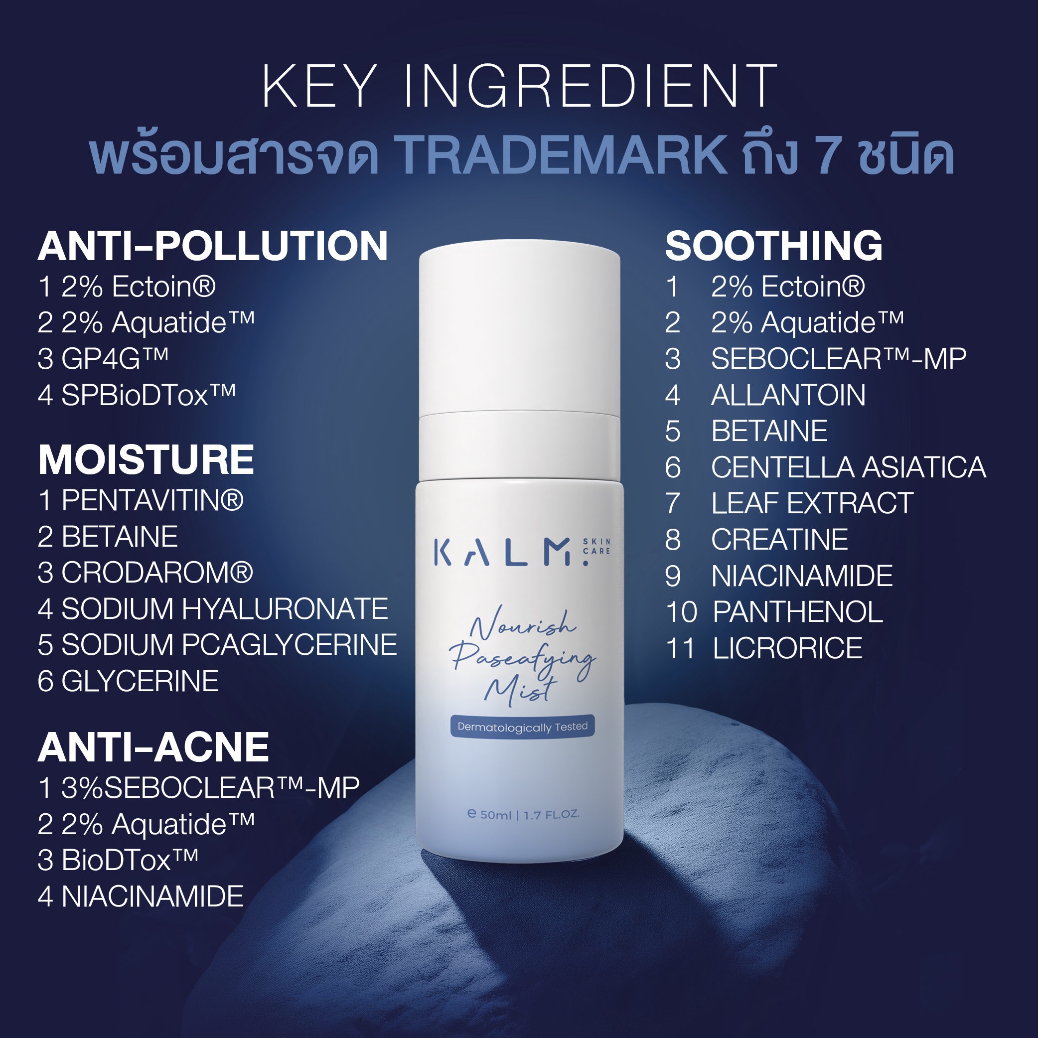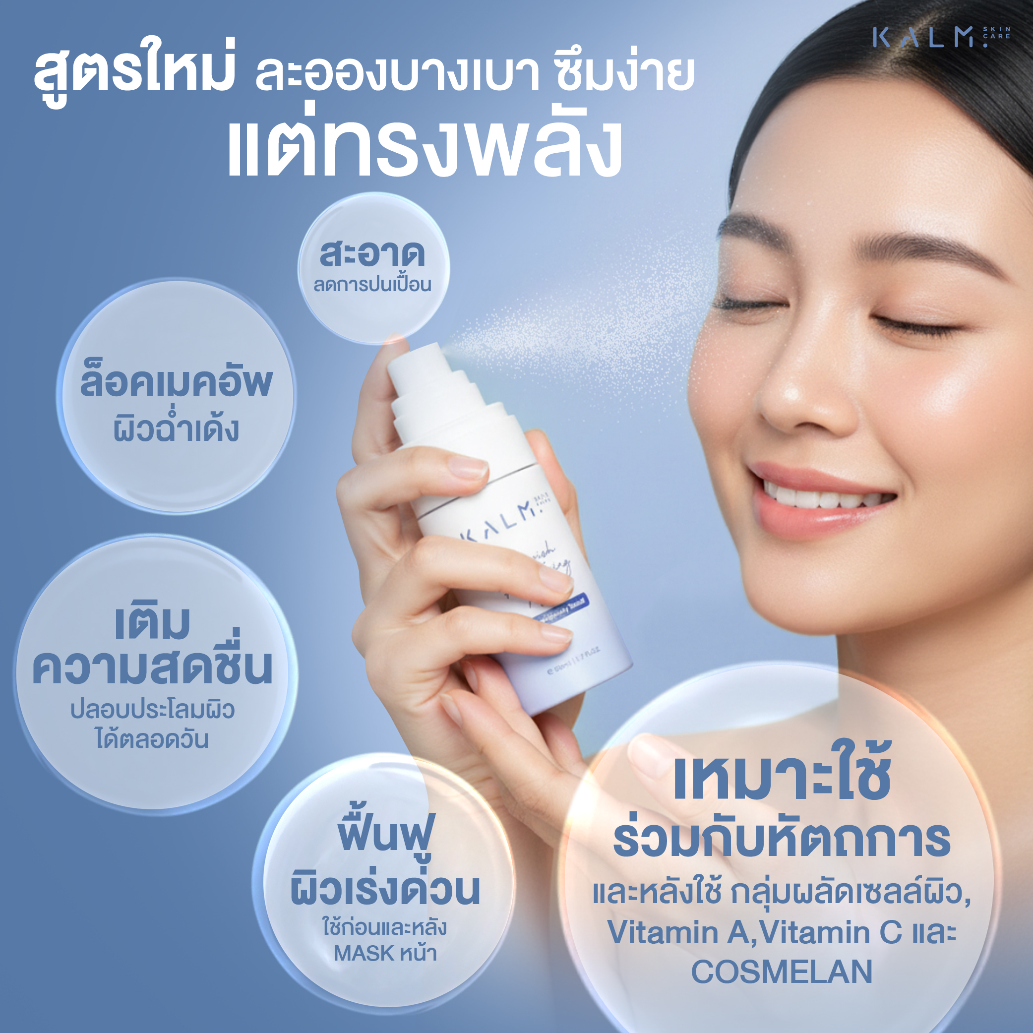 สเปรย์บนผิวหน้าและลำคอ เหมาะกับการใช้เตรียมผิวก่อนทาเซรั่ม สามารถใช้ระหว่างวันเพื่อบำรุงผิวได้ตลอดวัน เพื่อปลอบประโลมผิว เนื้อผลิตภัณฑ์บางเบาไม่เหนอะหนะ พ่นทับเมคอัพได้ ไม่เป็นคราบ